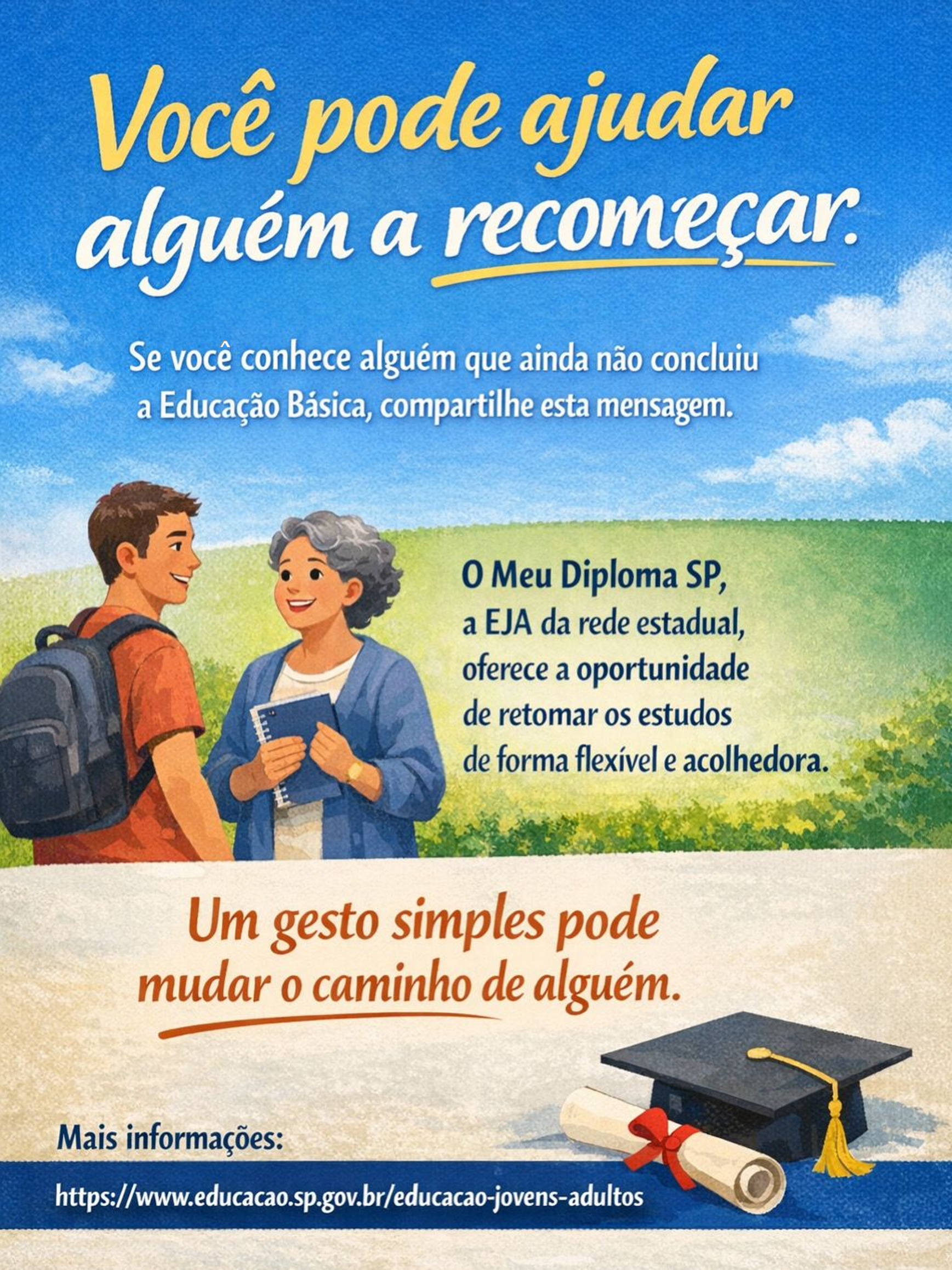 O Meu Diploma SP, a EJA da rede estadual, oferece a oportunidade de retomar os estudos de forma flexível e acolhedora. Um gesto simples pode mudar o caminho de alguém.
